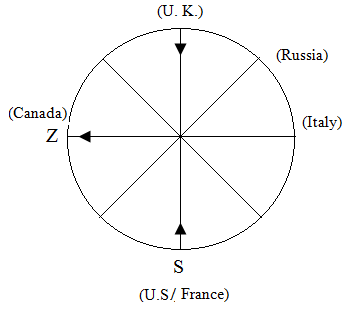 (2) Now from 'S is either the representative of France or United States' possibility 1 will be eliminated. Also from 'Representative of United Kingdom is facing the centre. Representative of Italy is sitting fourth to the right of the representative of Canada' we get the following information and also position of the person belongs to Italy get fixed.