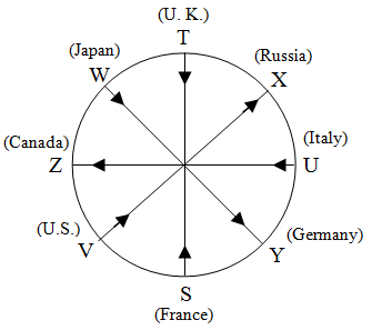 Representatives of the G-8 nations S, T, U, V, W, X, Y and Z are sitting around a circular table at equal distances but not necessarily in the same order. Some of them are facing the centre while some of them are facing outside (i.e. opposite to the centre). G-8 nations are United States (U.S.), United Kingdom (U.K.), Canada, Italy, France, Russia, Germany and Japan.