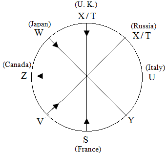 (4) At last from from 'Either both X and Z are facing the centre or both are facing outwards' we get that X is facing outwards and he belongs to Russia. Now from 'Either both U and T are facing the centre or both are facing outwards' we get U is facing inwards. From 'None of the immediate neighbours of U is facing the centre. Representative of United States is facing the centre' we get the final result as follows: